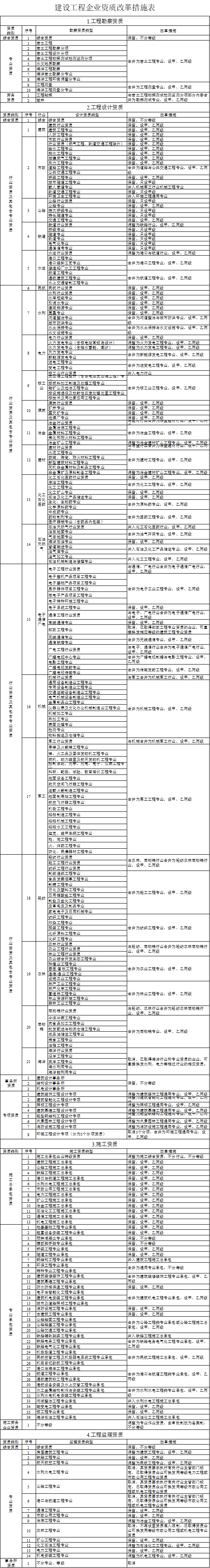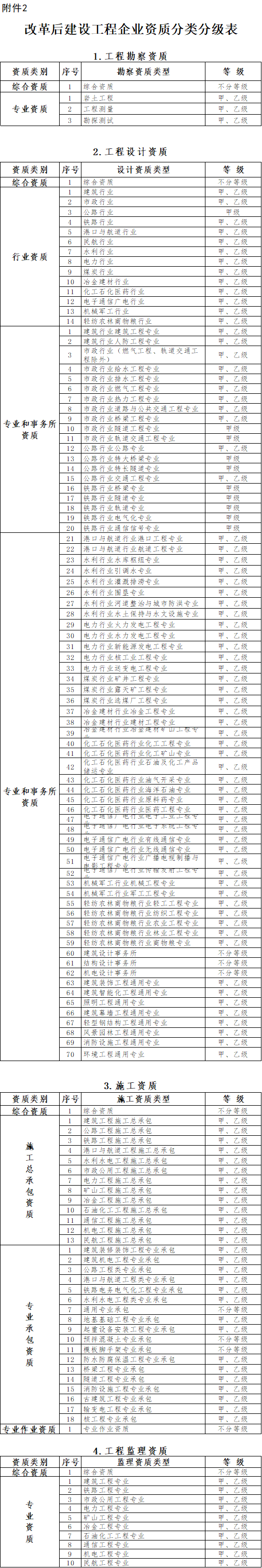 為貫徹落實2019年全國深化“放管服”改革優(yōu)化營商環(huán)境電視電話會議精神和李克強總理重要講話精神,按照《國務(wù)院辦公廳關(guān)于印發(fā)全國深化“放管服”改革優(yōu)化營商環(huán)境電視電話會議重點任務(wù)分工方案的通知》(國辦發(fā)〔2019〕39號)要求,深化建筑業(yè)“放管服”改革,做好建設(shè)工程企業(yè)資質(zhì)(包括工程勘察、設(shè)計、施工、監(jiān)理企業(yè)資質(zhì),以下統(tǒng)稱企業(yè)資質(zhì))認定事項壓減工作,現(xiàn)制定以下改革方案。以習近平新時代中國特色社會主義思想為指導,貫徹落實黨的十九大和十九屆二中、三中、四中、五中全會精神,充分發(fā)揮市場在資源配置中的決定性作用,更好發(fā)揮政府作用,堅持以推進建筑業(yè)供給側(cè)結(jié)構(gòu)性改革為主線,按照國務(wù)院深化“放管服”改革部署要求,持續(xù)優(yōu)化營商環(huán)境,大力精簡企業(yè)資質(zhì)類別,歸并等級設(shè)置,簡化資質(zhì)標準,優(yōu)化審批方式,進一步放寬建筑市場準入限制,降低制度性交易成本,破除制約企業(yè)發(fā)展的不合理束縛,持續(xù)激發(fā)市場主體活力,促進就業(yè)創(chuàng)業(yè),加快推動建筑業(yè)轉(zhuǎn)型升級,實現(xiàn)高質(zhì)量發(fā)展。(一)精簡資質(zhì)類別,歸并等級設(shè)置。為在疫情防控常態(tài)化條件下做好“六穩(wěn)”工作、落實“六?!比蝿?wù),進一步優(yōu)化建筑市場營商環(huán)境,確保新舊資質(zhì)平穩(wěn)過渡,保障工程質(zhì)量安全,按照穩(wěn)中求進的原則,積極穩(wěn)妥推進建設(shè)工程企業(yè)資質(zhì)管理制度改革。對部分專業(yè)劃分過細、業(yè)務(wù)范圍相近、市場需求較小的企業(yè)資質(zhì)類別予以合并,對層級過多的資質(zhì)等級進行歸并。改革后,工程勘察資質(zhì)分為綜合資質(zhì)和專業(yè)資質(zhì),工程設(shè)計資質(zhì)分為綜合資質(zhì)、行業(yè)資質(zhì)、專業(yè)和事務(wù)所資質(zhì),施工資質(zhì)分為綜合資質(zhì)、施工總承包資質(zhì)、專業(yè)承包資質(zhì)和專業(yè)作業(yè)資質(zhì),工程監(jiān)理資質(zhì)分為綜合資質(zhì)和專業(yè)資質(zhì)。資質(zhì)等級原則上壓減為甲、乙兩級(部分資質(zhì)只設(shè)甲級或不分等級),資質(zhì)等級壓減后,中小企業(yè)承攬業(yè)務(wù)范圍將進一步放寬,有利于促進中小企業(yè)發(fā)展。具體壓減情況如下:1.工程勘察資質(zhì)。保留綜合資質(zhì);將4類專業(yè)資質(zhì)及勞務(wù)資質(zhì)整合為巖土工程、工程測量、勘探測試等3類專業(yè)資質(zhì)。綜合資質(zhì)不分等級,專業(yè)資質(zhì)等級壓減為甲、乙兩級。2.工程設(shè)計資質(zhì)。保留綜合資質(zhì);將21類行業(yè)資質(zhì)整合為14類行業(yè)資質(zhì);將151類專業(yè)資質(zhì)、8類專項資質(zhì)、3類事務(wù)所資質(zhì)整合為70類專業(yè)和事務(wù)所資質(zhì)。綜合資質(zhì)、事務(wù)所資質(zhì)不分等級;行業(yè)資質(zhì)、專業(yè)資質(zhì)等級原則上壓減為甲、乙兩級(部分資質(zhì)只設(shè)甲級)。3.施工資質(zhì)。將10類施工總承包企業(yè)特級資質(zhì)調(diào)整為施工綜合資質(zhì),可承擔各行業(yè)、各等級施工總承包業(yè)務(wù);保留12類施工總承包資質(zhì),將民航工程的專業(yè)承包資質(zhì)整合為施工總承包資質(zhì);將36類專業(yè)承包資質(zhì)整合為18類;將施工勞務(wù)企業(yè)資質(zhì)改為專業(yè)作業(yè)資質(zhì),由審批制改為備案制。綜合資質(zhì)和專業(yè)作業(yè)資質(zhì)不分等級;施工總承包資質(zhì)、專業(yè)承包資質(zhì)等級原則上壓減為甲、乙兩級(部分專業(yè)承包資質(zhì)不分等級),其中,施工總承包甲級資質(zhì)在本行業(yè)內(nèi)承攬業(yè)務(wù)規(guī)模不受限制。4.工程監(jiān)理資質(zhì)。保留綜合資質(zhì);取消專業(yè)資質(zhì)中的水利水電工程、公路工程、港口與航道工程、農(nóng)林工程資質(zhì),保留其余10類專業(yè)資質(zhì);取消事務(wù)所資質(zhì)。綜合資質(zhì)不分等級,專業(yè)資質(zhì)等級壓減為甲、乙兩級。(二)放寬準入限制,激發(fā)企業(yè)活力。住房和城鄉(xiāng)建設(shè)部會同國務(wù)院有關(guān)主管部門制定統(tǒng)一的企業(yè)資質(zhì)標準,大幅精簡審批條件,放寬對企業(yè)資金、主要人員、工程業(yè)績和技術(shù)裝備等的考核要求。適當放寬部分資質(zhì)承攬業(yè)務(wù)規(guī)模上限,多個資質(zhì)合并的,新資質(zhì)承攬業(yè)務(wù)范圍相應(yīng)擴大至整合前各資質(zhì)許可范圍內(nèi)的業(yè)務(wù),盡量減少政府對建筑市場微觀活動的直接干預(yù),充分發(fā)揮市場在資源配置中的決定性作用。(三)下放審批權(quán)限,方便企業(yè)辦事。進一步加大放權(quán)力度,選擇工作基礎(chǔ)較好的地方和部分資質(zhì)類別,開展企業(yè)資質(zhì)審批權(quán)下放試點,將除綜合資質(zhì)外的其他等級資質(zhì),下放至省級及以下有關(guān)主管部門審批(其中,涉及公路、水運、水利、通信、鐵路、民航等資質(zhì)的審批權(quán)限由國務(wù)院住房和城鄉(xiāng)建設(shè)主管部門會同國務(wù)院有關(guān)部門根據(jù)實際情況決定),方便企業(yè)就近辦理。試點地方要明確專門機構(gòu)、專業(yè)人員負責企業(yè)